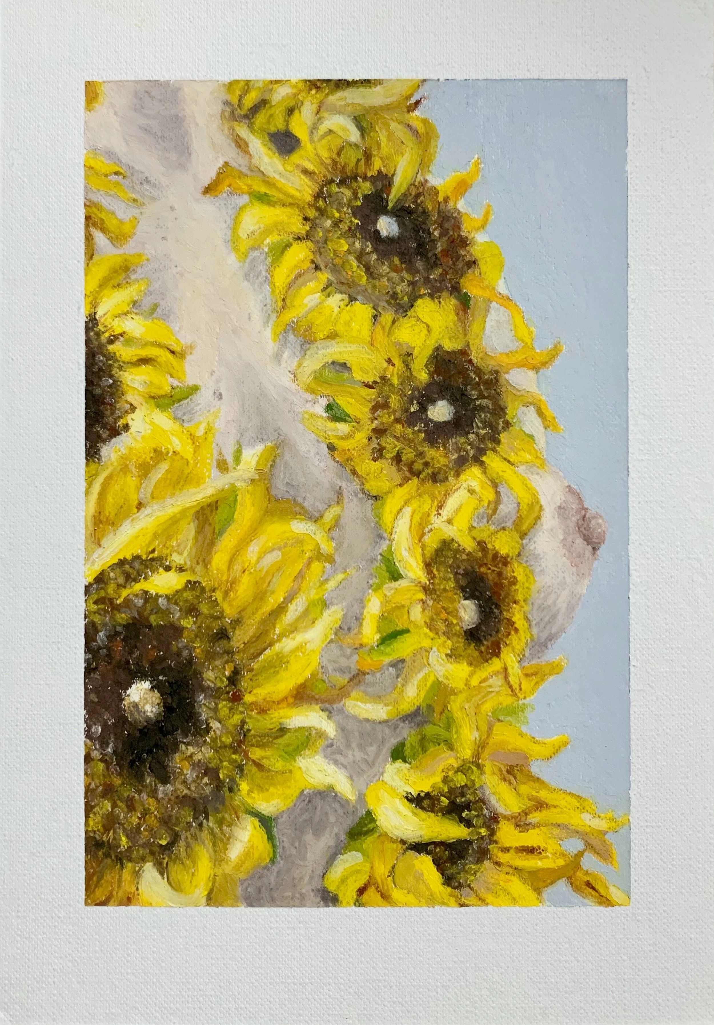 This painting explores the social issues surrounding hidden disabilities, represented by the sunflowers and gender equality, represented by the female nude.