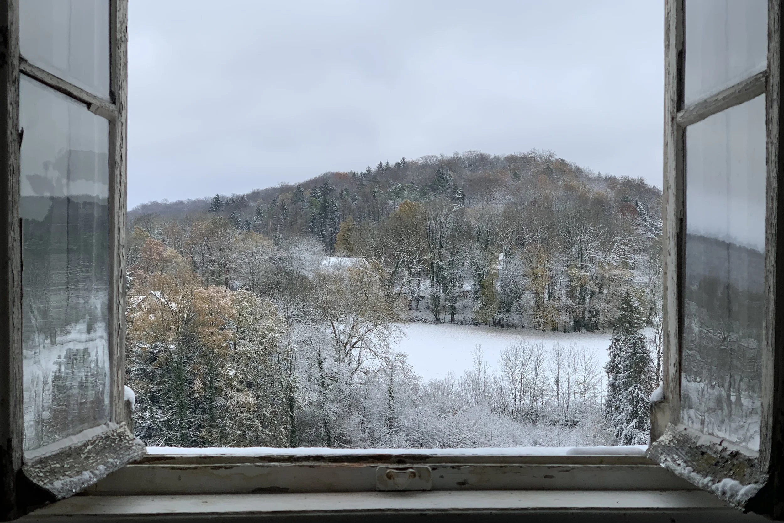 Watching the snow fall at Chateau d’Orquevaux.